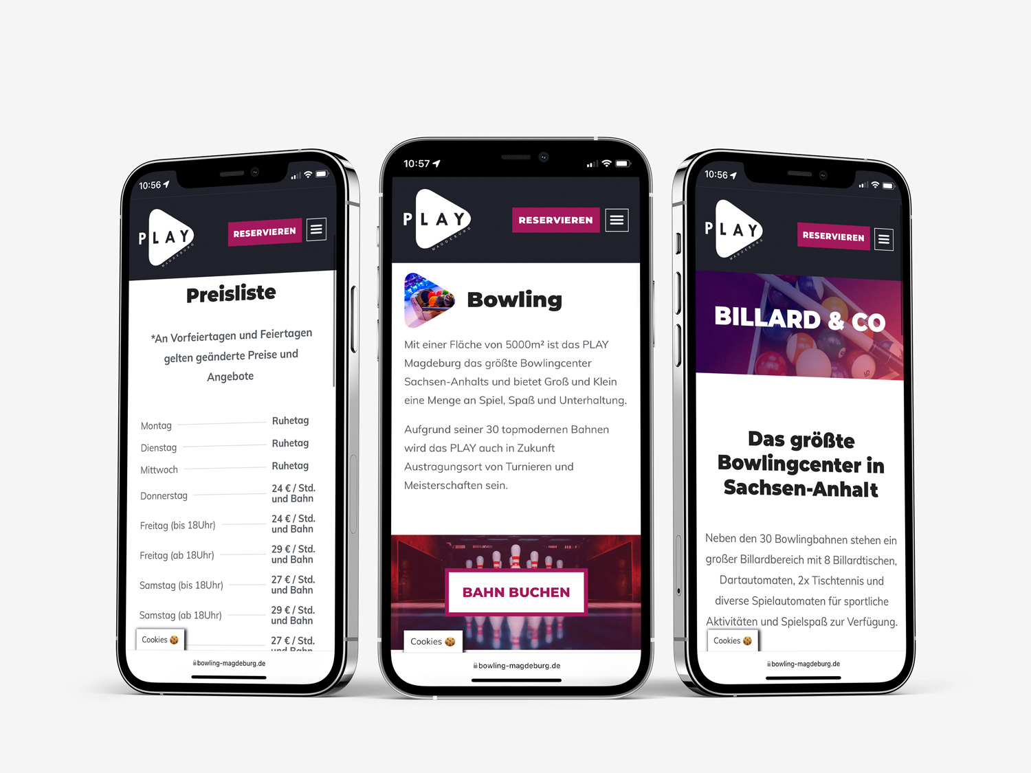Die neuen Webseiten zeigen die Farb- und Formgebung der zuvor entwickelten Play-CI. Zahlreiche Inhalte sind in das Play-Symbol (Dreieck) integriert und weisen somit schon digital auf der Webseite den Weg zu den Inhalten. Alle Landing-Pages sind responsiv optimiert und bieten jedem Besucher ein perfektes User-Interface. Über das Reservierungssystem 4bowl, können Besucher zusätzlich ganz einfach über ihr Smartphone die gewünschten Bahnen buchen.